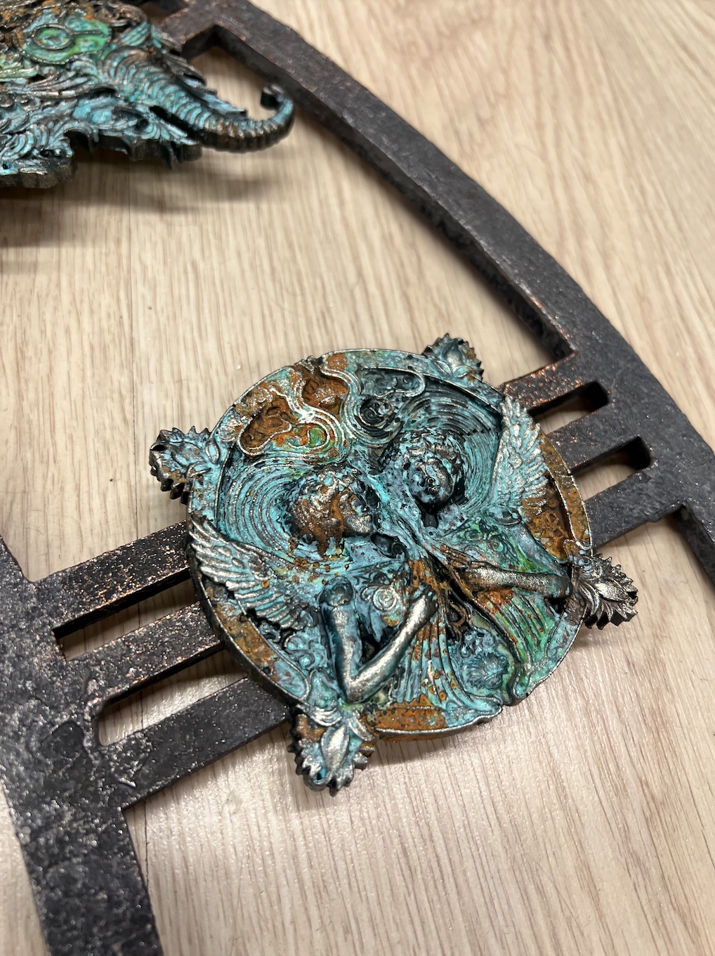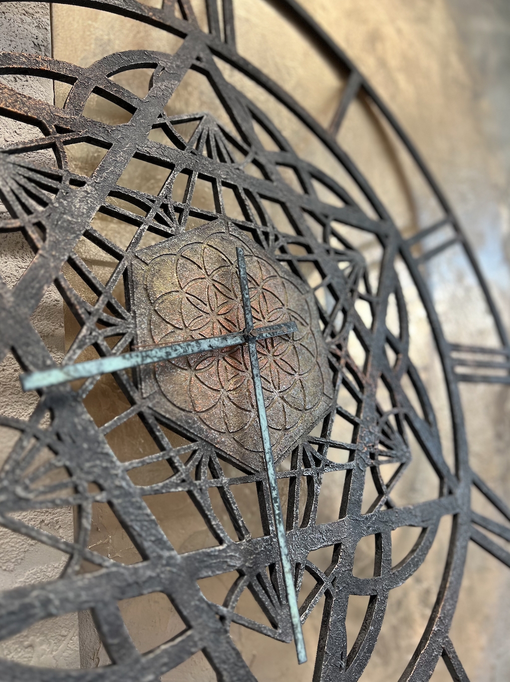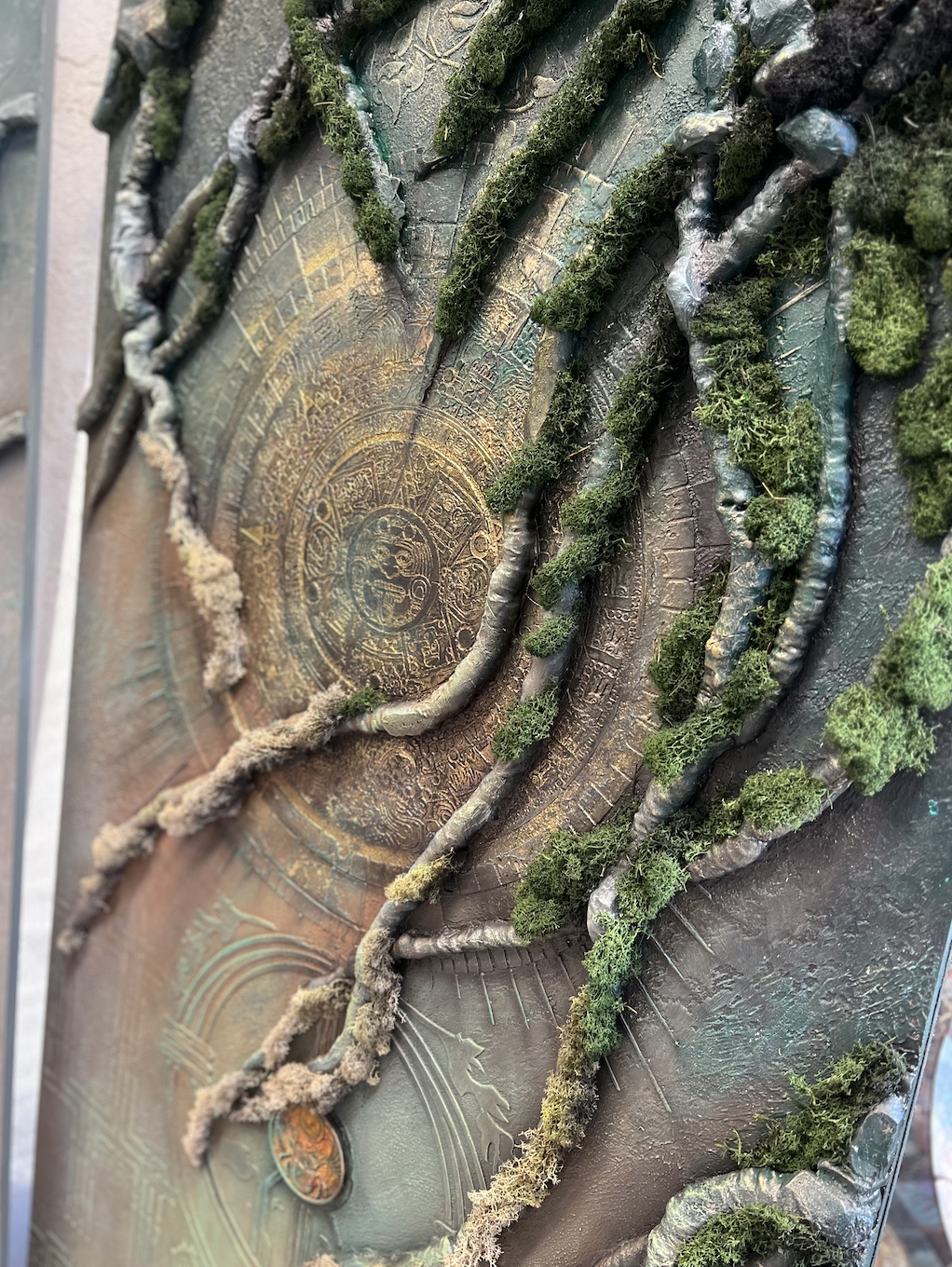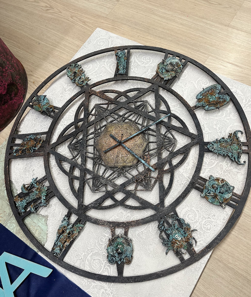 В работе постарались сочетать восточный и западный орнамент, добавили немного противостояний по цвету, эпохам и стилям, соединив их в пульсирующей мандале майянского календаря. Главный подход к работе - это разрыв указанных в битве шаблонов: восточный колорит цветов и переливов, смелые яркие акценты стали подложкой для классических и западных орнаментов, а западный приглушённый натуральный эко стиль вписался, как величественный и белоснежный Тадж-Махал в изящные оттиски восточного орнамента, где лишь намёком просачивается золотистая патина.
