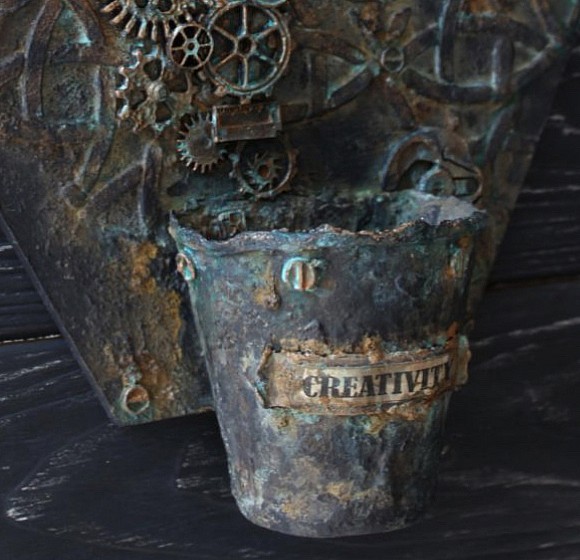 Можно нанести медь или бронзу с наночастицами металла, эти краски окисляются специальными активаторами: голубая и зеленая патины. Через полчаса после обильного нанесения можно просушить феном.