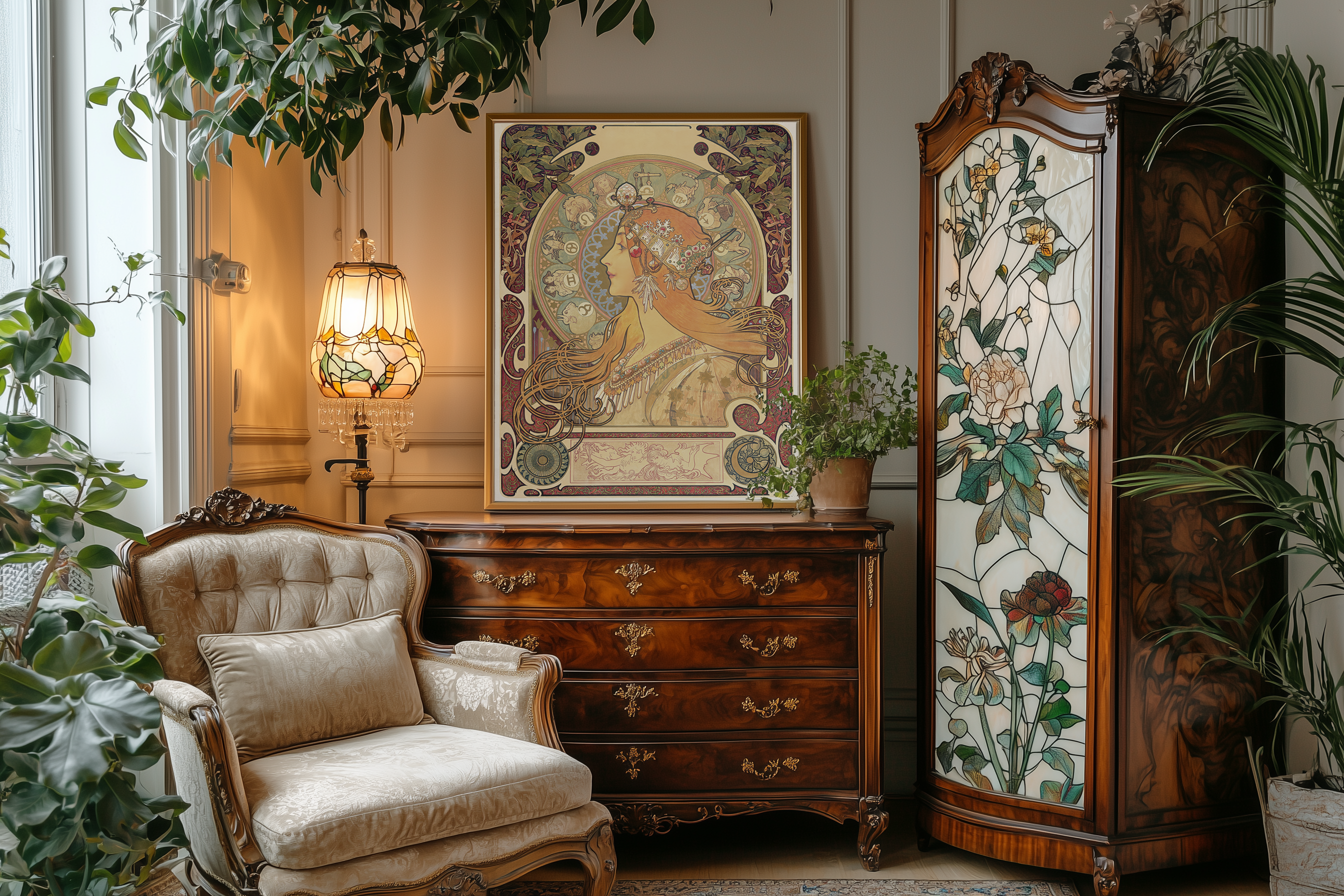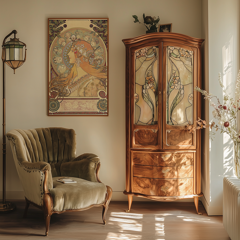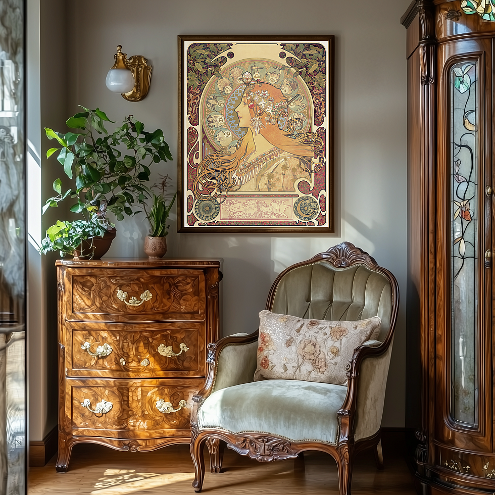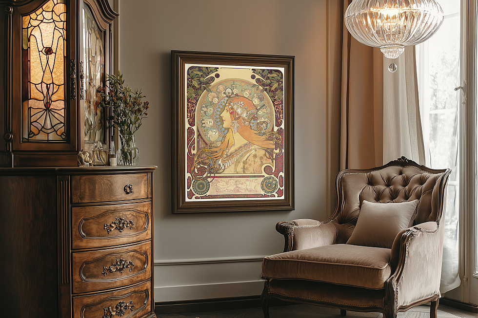 Невероятно красивые оригинальные работы Альфонса Мухи, переработанные нами в нейросетях с улучшенным для печати качеством могут стать яркими панно или декоративными элементами в мебели, зеркальных и стеклянных объектах.
